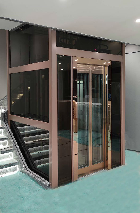 电梯选材:玫瑰金色钢架,轿厢观光玻璃配玫瑰金装潢,钢化玻璃,手机屏外呼