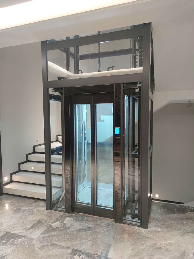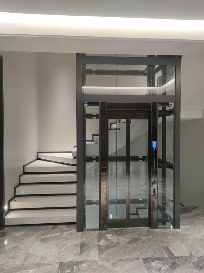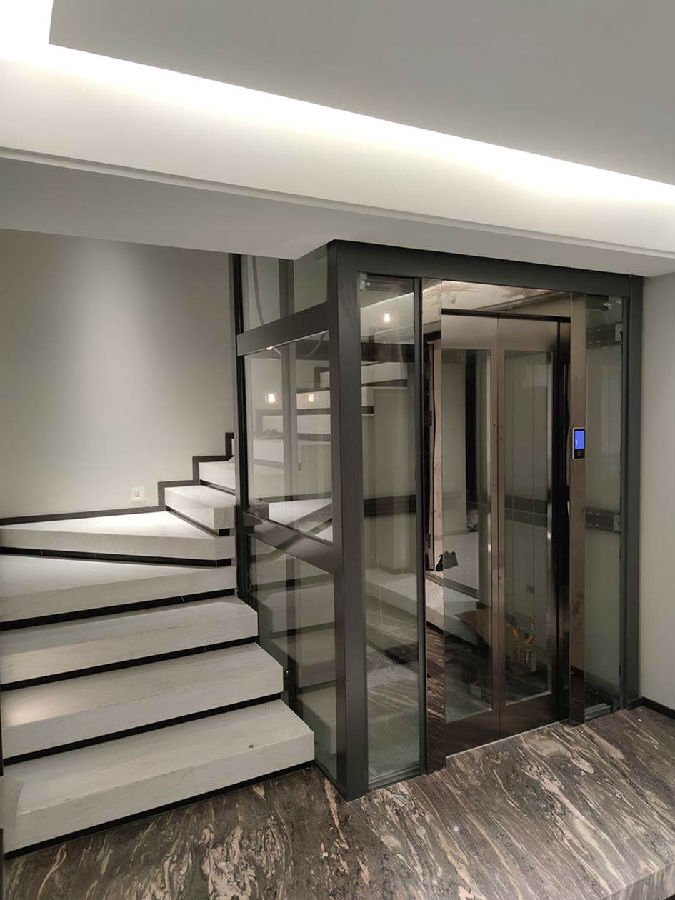 电梯选材:观光钢架黑银色+钢带检测装置+.轿厢厅门轿门观光玻璃配钛黑装潢+手机屏+透明8mm钢化玻璃