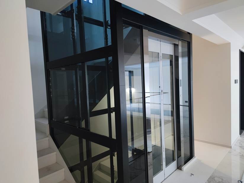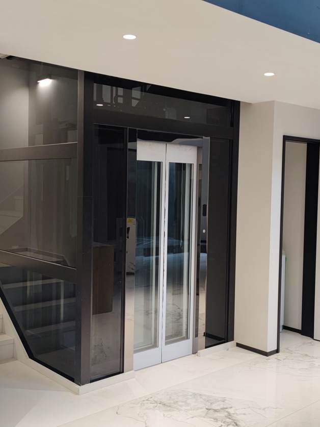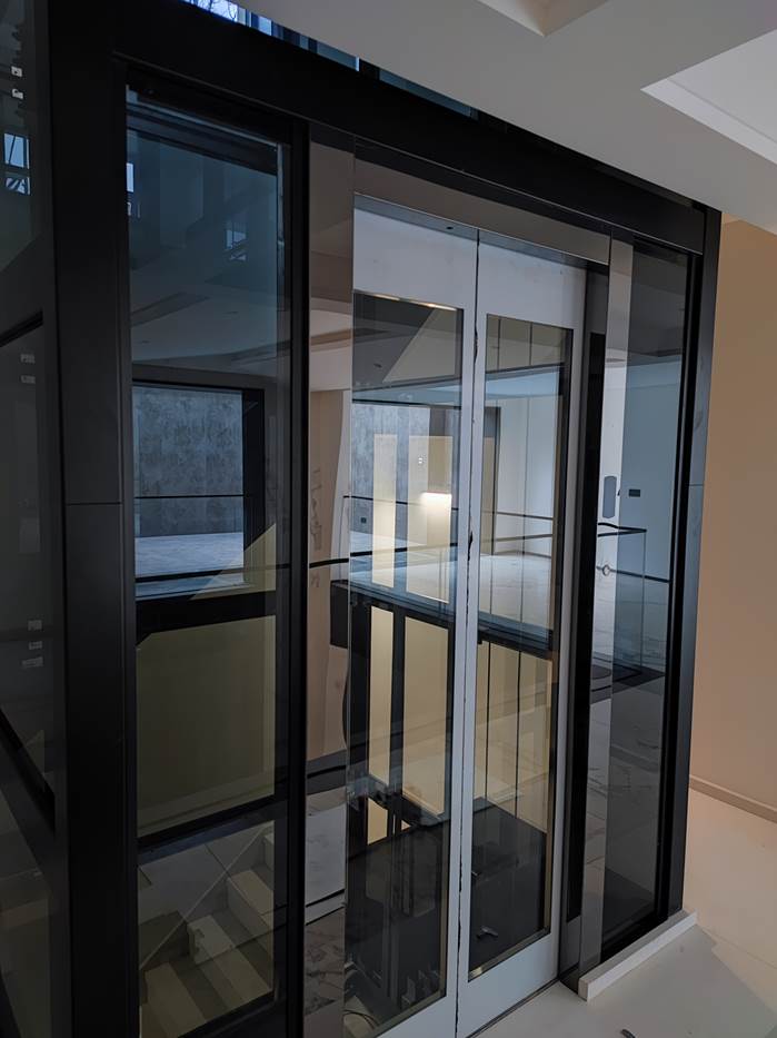 电梯选材:轿厢、厅门、轿门观光配钛黑镜面+黑色观光钢架