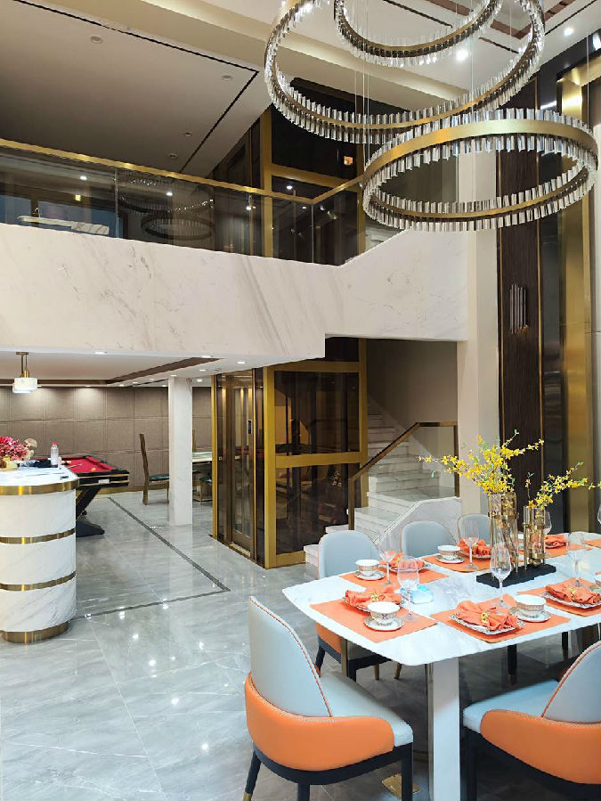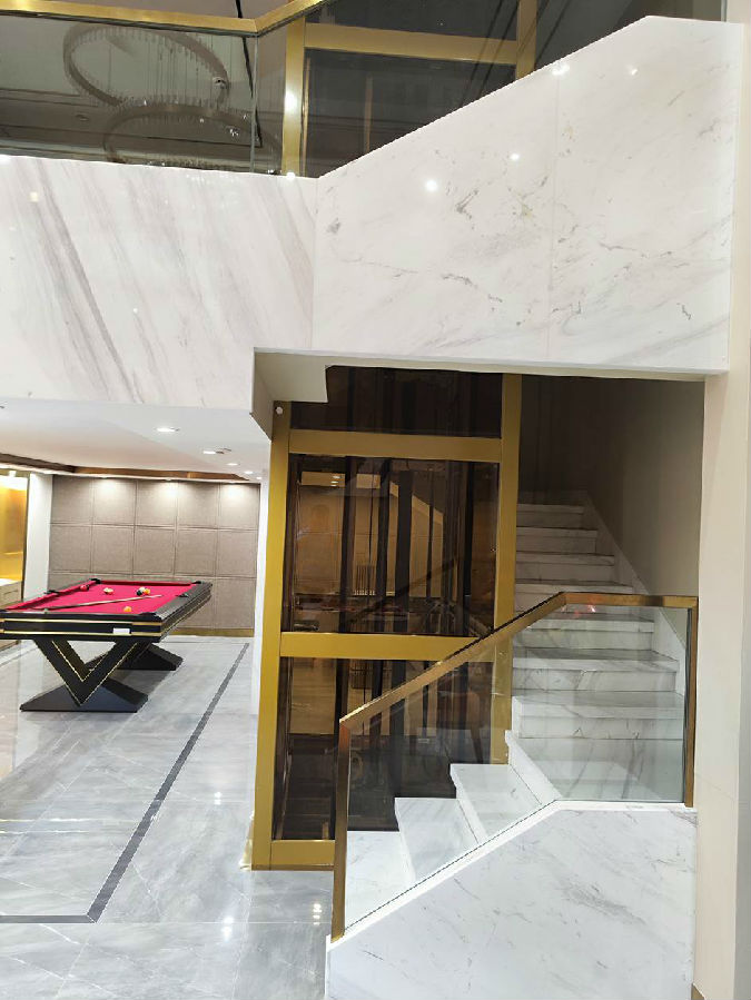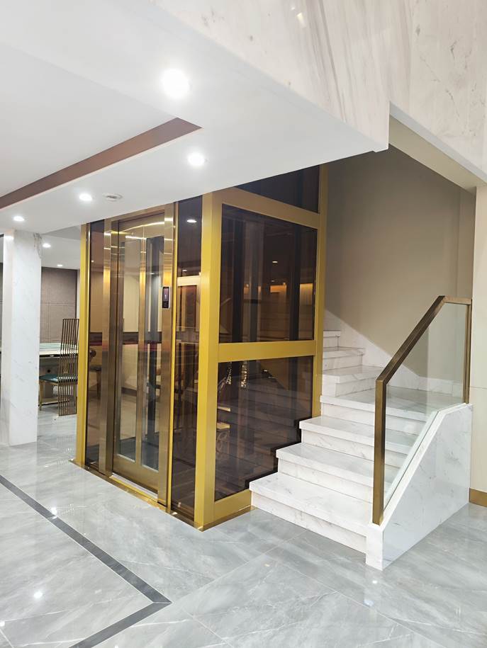 电梯选材:金色观光钢架+轿厢厅门轿门观光配钛金发纹+茶色8mm钢化玻璃
