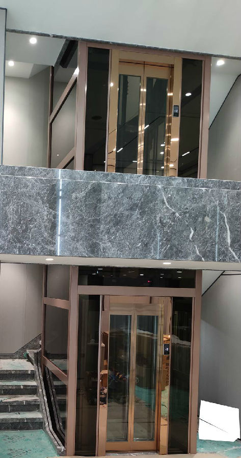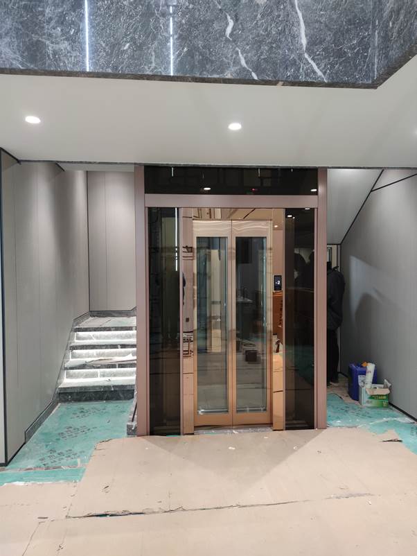 电梯选材:玫瑰金色钢架,轿厢观光玻璃配玫瑰金装潢,钢化玻璃,手机屏外呼