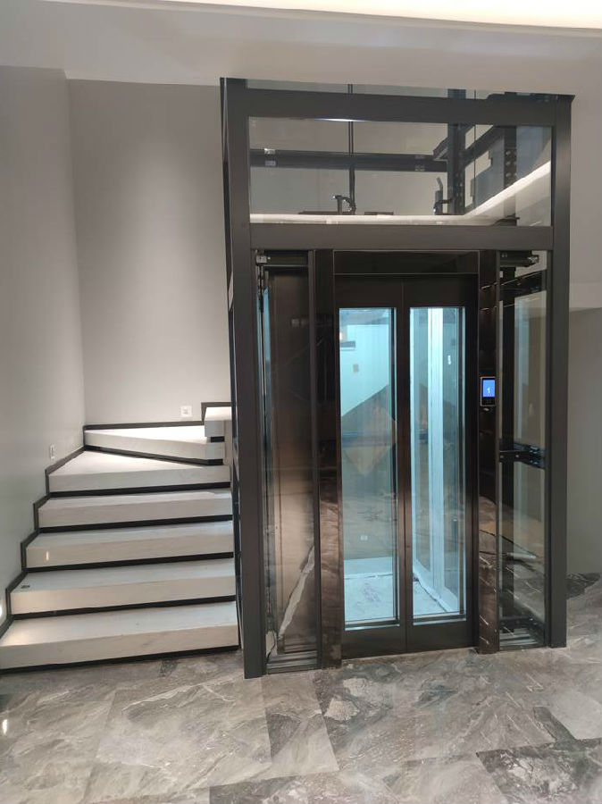 电梯选材:观光钢架黑银色+钢带检测装置+.轿厢厅门轿门观光玻璃配钛黑装潢+手机屏+透明8mm钢化玻璃